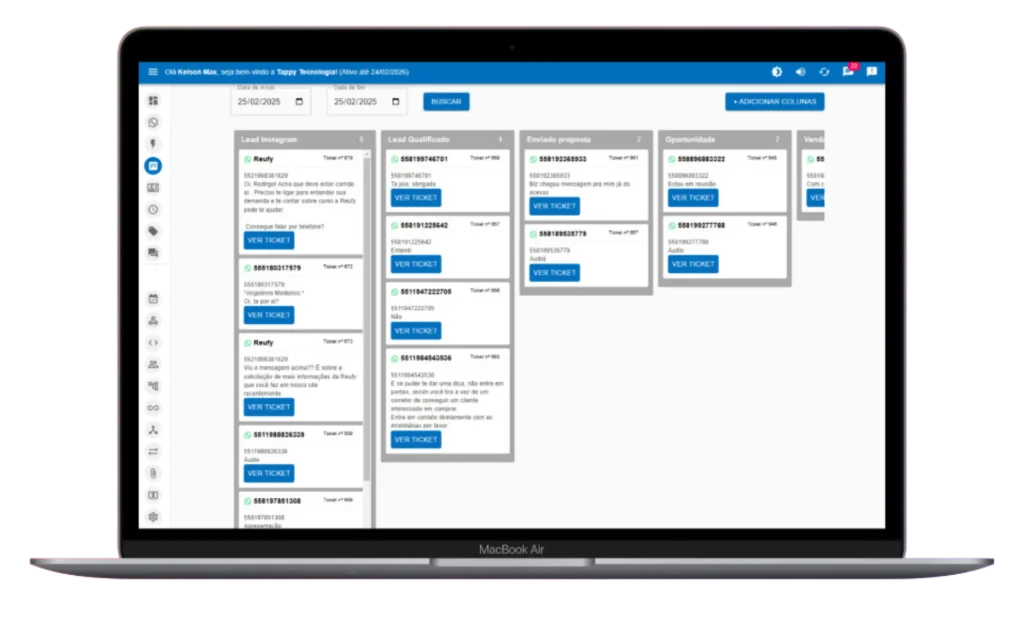 El Kanban te permite organizar visualmente el paso a paso de la atención. Puedes crear columnas como «Nuevos Leads», «En Negociación» y «Cerrados», moviendo los contactos a medida que avanzan en el embudo. Esto ayuda a no perder oportunidades y a mantener el control de cada cliente.